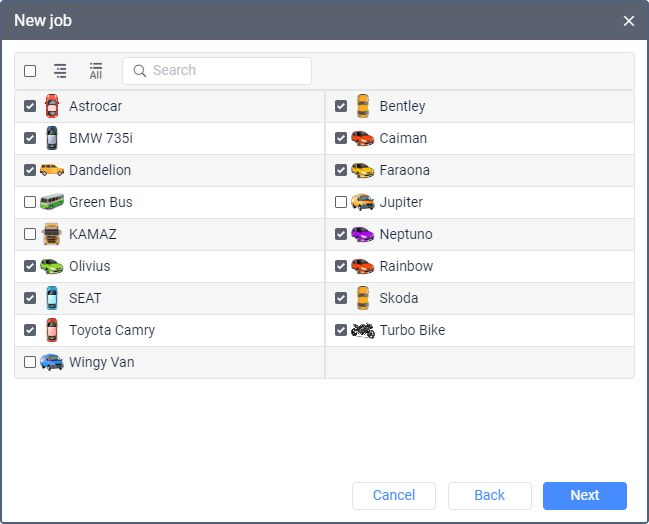 To select units or groups for which you want to create a job, mark them in the list. To select all the items at once, mark any of them holding down the Ctrl key, or select the checkbox in the table header.