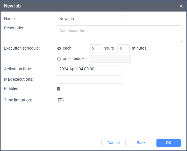 Max executions | The maximum number of the job executions after reaching which the job is automatically disabled. If this field is empty, the job is carried out until it is deleted or disabled manually. |