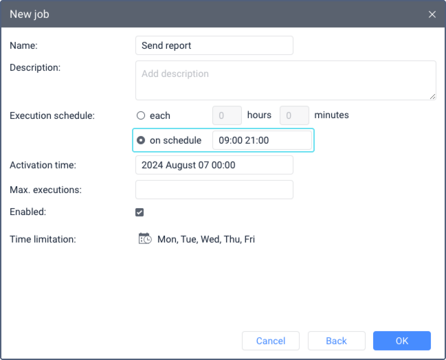 In this case, the job will be carried out at 9 a.m. and 9 p.m. on the days selected in the Time limitation parameter, or every day if the limitation is not set. |