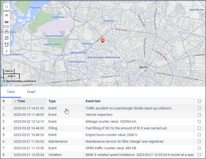 Event text | The description of the event. If the event is registered by means of a notification, the description is taken from its text. If it is registered by means of a job, the system generates the description automatically. In the case of manual registration, custom events and unit statuses are displayed with the descriptions specified by the user, while fuel fillings and maintenance services have the descriptions generated automatically. |