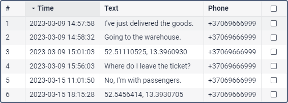 When you request this type of messages, you can see a table with the SMS messages sent to the server by the unit when executing commands, triggering the alarm, and in other cases depending on the device configuration.