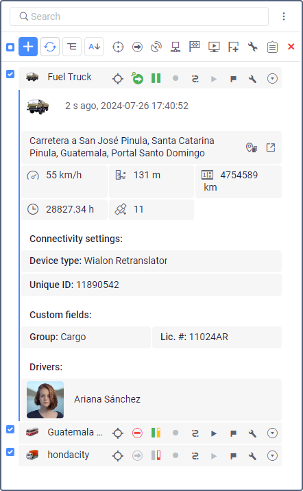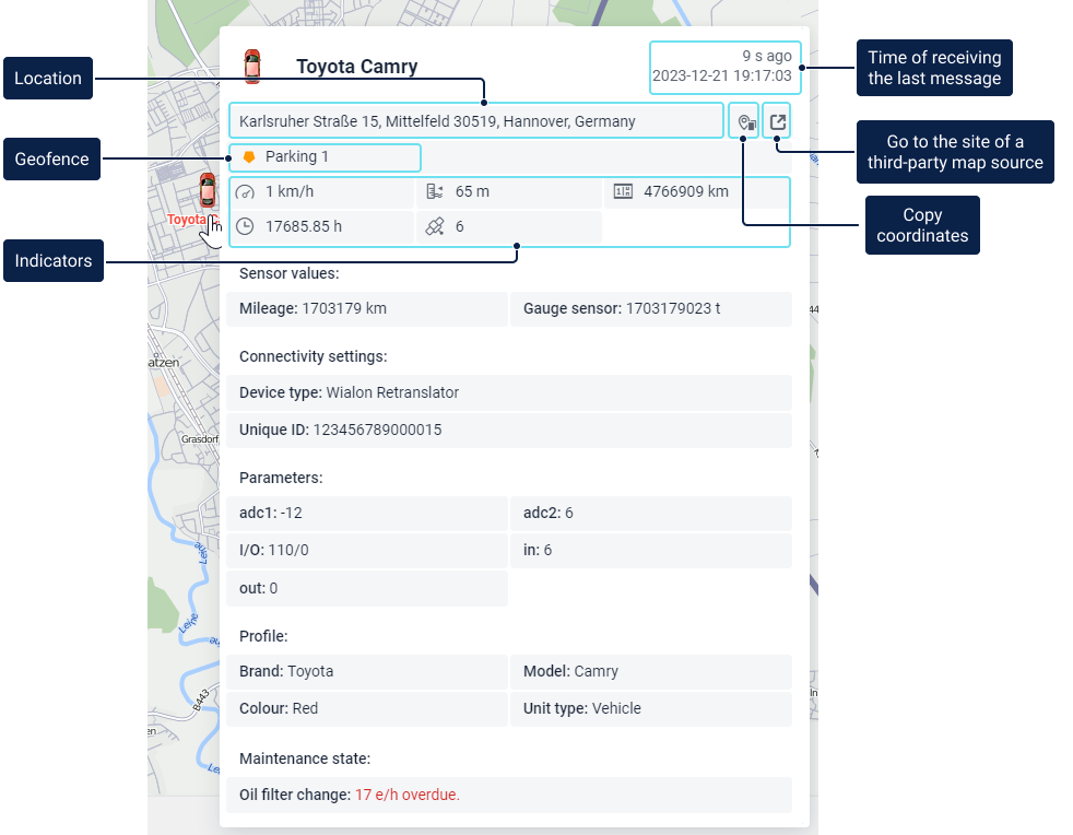 Additional information includes the following data: the time of receiving the last message, location, presence in geofences, distance to the nearest geofence, speed, altitude, counters, satellites, connectivity settings, unit icon, sensor values, parameters, assigned drivers and trailers, custom fields, and maintenance intervals.