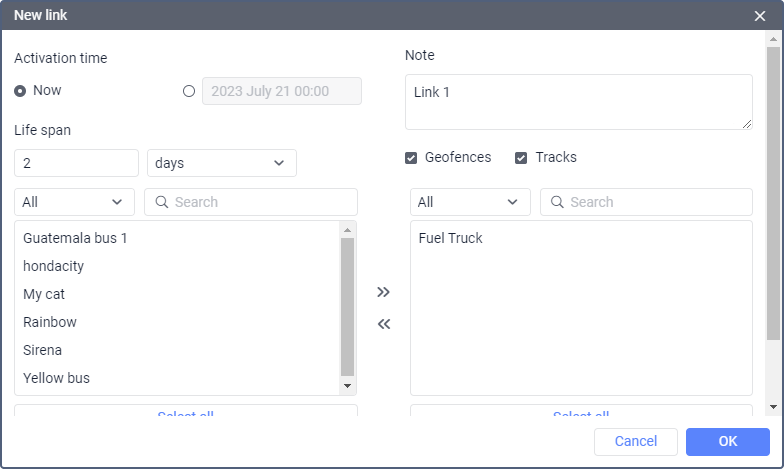 You can also check the Geofences box here to share them in the link. Moreover, you can provide the possibility of generating and viewing the track of a unit by activating the Tracks checkbox.