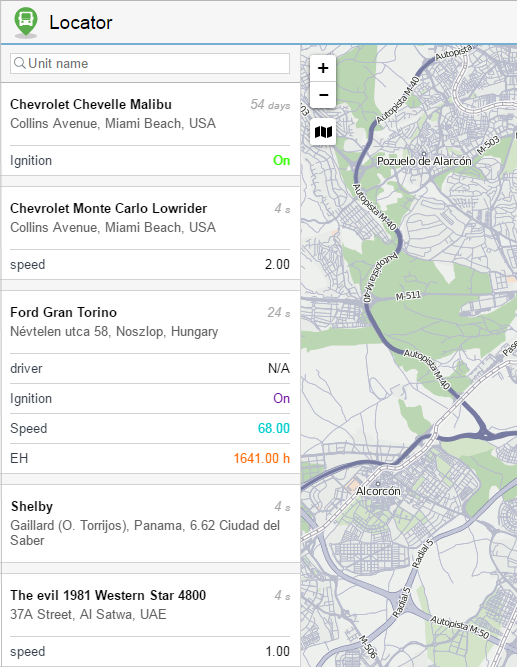 If sensor masks have been indicated when generating a link, in the left part of the window of the locator there will be a list of units with their names, the time of receiving the last message and the latest location, as well as the names of the sensors, their values and units of measurement. If for some sensor intervals and colors are set, the adjusted color will be used for showing its value in the list. To find units by name, use the dynamic search above the list.