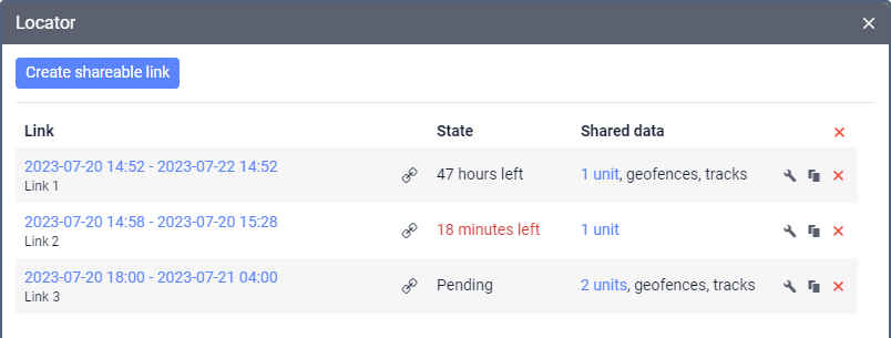 Generated links get in the corresponding list containing such information as the start and end time of its operation, how much is left before the expiration date (if the activation time has already come), the number of units, as well as whether geofences and tracks are shown on the map of the locator. When you hover the cursor over the number of units, its list is shown in the tooltip. If there is less than one hour left before the link’s expiration, the corresponding line is highlighted in red.