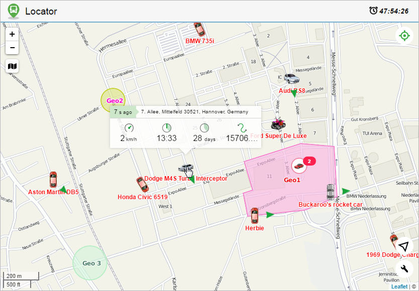After the unit has been found, you can view its latest data. The data is shown in the window that is opened by clicking on the unit. The amount of provided information depends on the unit state (moving/stationary). If it is moving (movement arrow is an indicator), then the following parameters are shown for it: speed, time of movement, its duration, and covered distance. For a unit which is not moving such parameters as speed and covered distance are irrelevant, therefore only two parameters are shown for it: the time of the start of the stationary state and its duration. Besides, regardless of the unit state the header of the opened window contains such information as the time passed from the last message and address from the last message. The unit address is determined by Gurtam Maps, irrespective of the selected base map. Note that upon receiving new messages either position of a unit on the map or its current parameters are automatically refreshed.