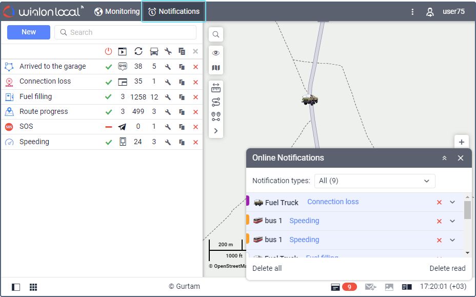 Using notifications in the monitoring system, you can control unit movement, sensor readings, driver and trailer assignments, and so on. If a notification is triggered, the following actions are possible: