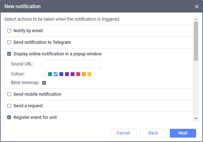 - Select one or several actions which should be performed after the notification is triggered. It can be sending the notification in different ways, registering an event or performing an action with system objects.