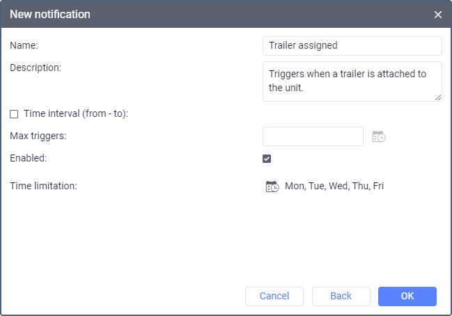 - Specify the name of the notification and the parameters related to the time and duration of its triggering. Click OK to save the changes.