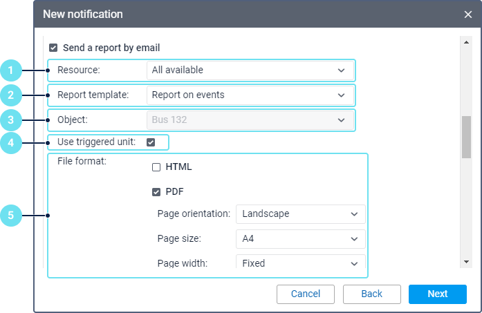 - If necessary, enable the Triggered unit option. It is only available for reports on unit or unit group. If the option is enabled, the report is executed only on the unit that triggered the notification, regardless of the object selected in the previous list.