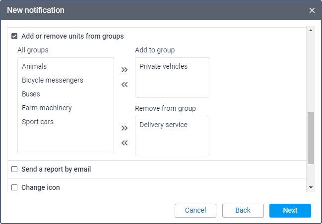 This action allows you to add or remove the selected unit from certain groups. To add the unit to the group when the notification is triggered, click on the required group in the All groups list and, using the icon