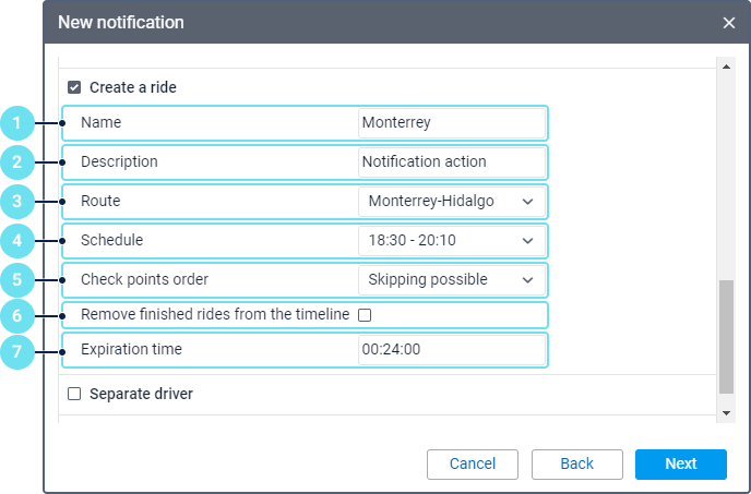 This action allows you to automatically separate the driver from the unit. If several drivers are assigned to a unit, all of them are separated after the notification is triggered. The drivers and the notification should belong to the same resource.