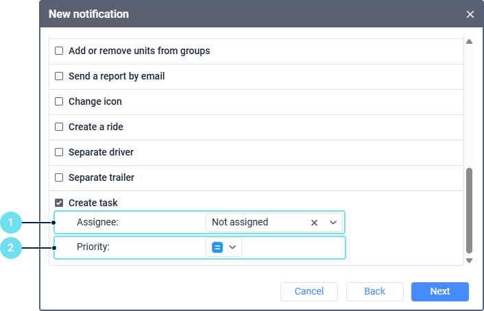 This action allows you to automatically separate the trailer from the unit. If several trailers are assigned to a unit, all of them are separated after the notification is triggered. The trailers and the notification should belong to the same resource.