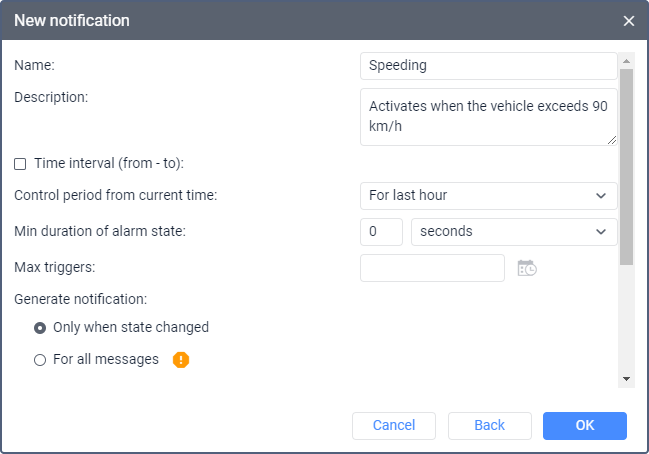 | Min duration of the previous state* | The parameter which allows you to prevent unnecessary triggering. Available if the Only when state changed option is selected for the Generate notification parameter. If the time which passes before the beginning of the alarm state is equal to or greater than specified in this parameter, a notification is triggered. This prevents repeated triggering in cases where the alarm state is interrupted for a short period of time. Specify the minimum duration of the previous state in seconds, minutes or hours, and select a unit of time in the drop-down list. The maximum allowed value is 24 hours (1440 minutes, 86,400 seconds). Example. A user has configured a notification of the Speed type with the range of allowed speed from 0 to 60 km/h. The specified minimum duration of the previous state is 2 minutes. This means that if the speed is exceeded, the notification will be triggered only if there have been no speed limit violations for at least 2 minutes after the last triggering.