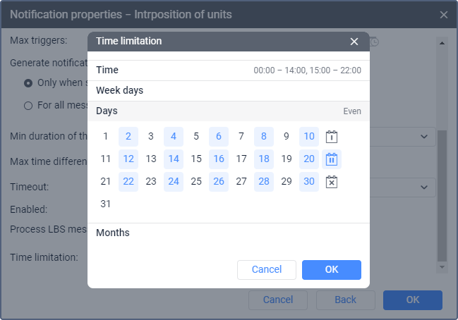 | Time limitation | The setting which allows you to specify the time and select the days and/or months during which the notification parameters should be controlled. For example, they can be controlled only on weekdays and within working hours, or only on odd days, and so on. You can learn how to set a time limitation below. Unlike the time limitation applied to the Max triggers parameter, this setting takes into account the time the message was generated, and not the time it was registered on the server. Therefore, even if a message generated on the specified day or interval is unloaded from the black box at a time when the notification parameters shouldn’t be controlled, the notification is still triggered. The exceptions are the notifications of the Alarm and Connection loss types where the time of the message registration on the server is taken into account. If the alarm state starts within the specified day or interval and its maximum duration is exceeded, then the notification is triggered even if the alarm state ends at the time when the notification parameters shouldn’t be controlled. |