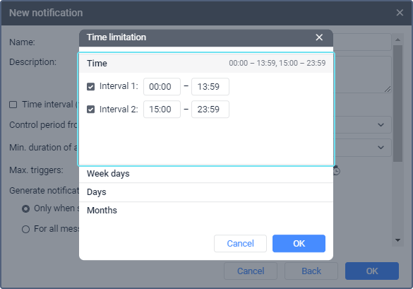If you specify a limitation only in the Time section, the notification parameters are monitored during the specified intervals every day. If you select days and months in addition to the time intervals, the system controls the notification parameters during the specified intervals only on these days and months. If you specify a limitation only in the Months section, the notification parameters are constantly monitored during the selected months.