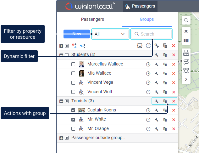 . To quickly find the required passenger group, use the dynamic filter or the filter by property (assigned or not assigned passengers) or by resource.