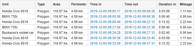 | Unit | The name of the unit which visited the geofence. If the interval type is Outside geofence, the name of the unit which was outside the geofence. |