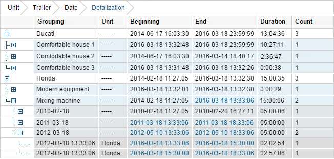 Below you can see an example of the report on trailer groups with four-level nesting: trailers, units, dates/weeks/months, single assignments.