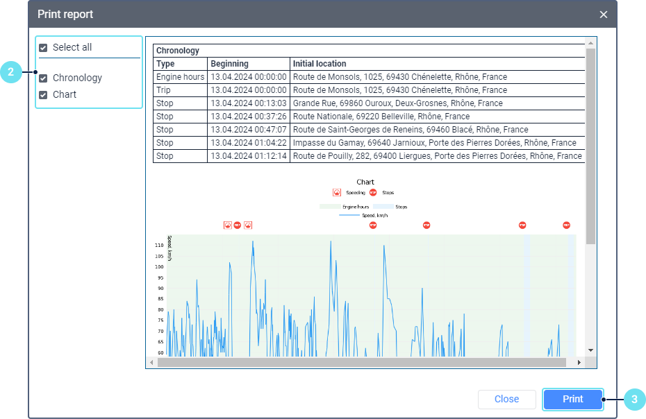 in the toolbar above the executed report. - In the left part of the window, select the tables, charts and other report sections you want to print out. To select all the sections, click Select all. The report contents are displayed in the right part.