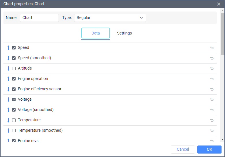 This option allows you to specify the sensors on the basis of which the chart should be built. The option does not influence the Speed, Altitude, Fuel consumption by math charts, as they can be built regardless of whether a unit has sensors or not.