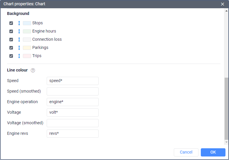 The intervals of such events as stops, parkings, trips, connection losses, and work of engine hours can be used as a chart background. Using these backgrounds you can correlate a chart value and an interval to which it corresponds. Different colors can be assigned for the event intervals. To select a color, click on the color box, choose the color from the palette and click OK.