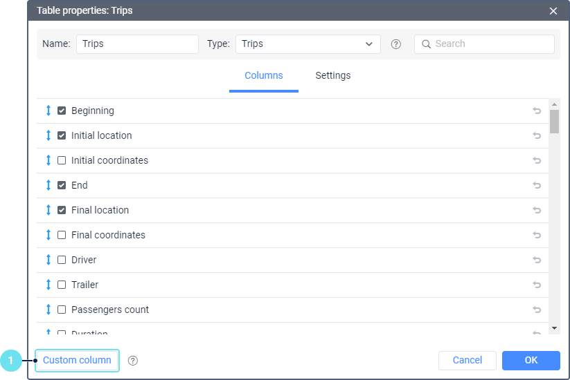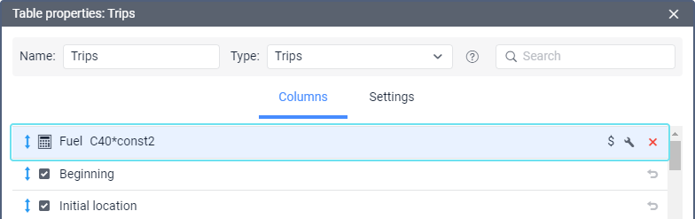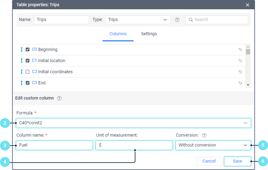 You can add custom columns to all the tables except for Images and Video. They are used to calculate values on the basis of data from other columns, unit parameters, the report interval, and so on. Custom columns can also display text values such as the unique ID, profile properties of the unit, and text values of custom fields.