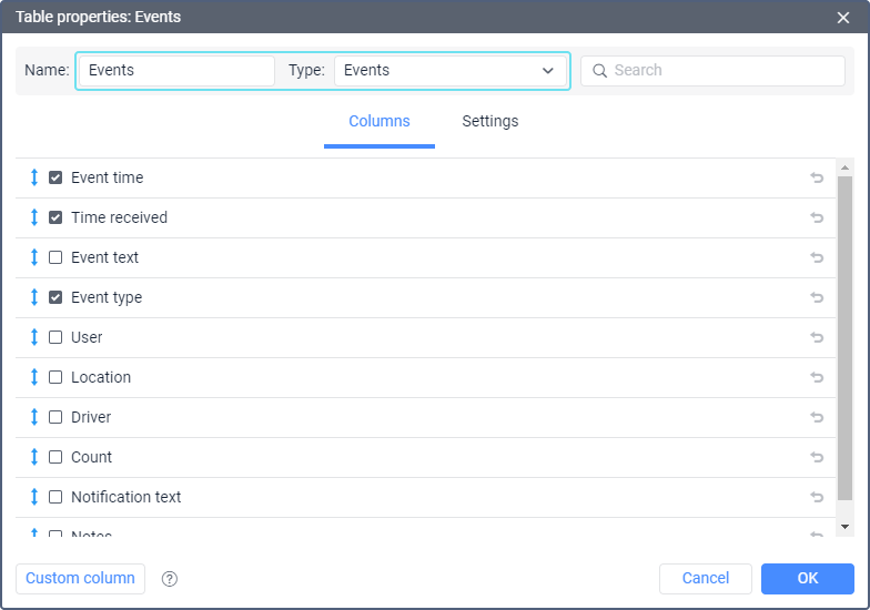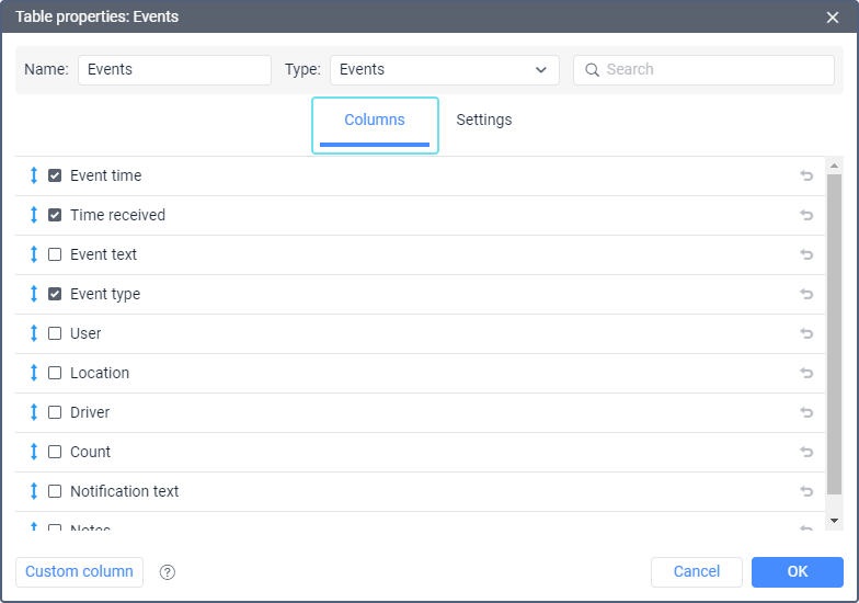 The set of available columns depends on the selected table type. To add a column to the table, check the box to the left of its name. To add all columns at once, hold down Ctrl and mark any column which is not selected. You can cancel the selection of all columns in the same way. To quickly search for columns, use the dynamic filter in the upper-right corner.