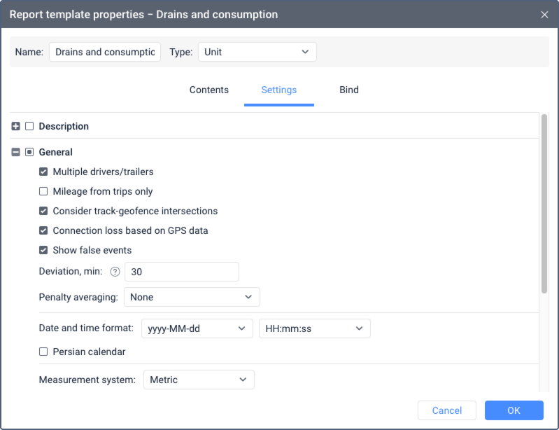 This option defines the units of measurement for such parameters as mileage, speed, fuel, and temperature in reports.