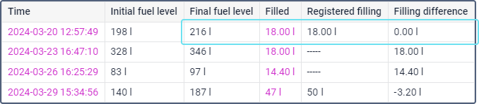 If the same filling has been automatically detected by a fuel sensor and registered manually, the Fuel fillings and battery charges table shows the volume data in one row in the Filled and Registered filling columns respectively. Also, the table shows the difference between the values of these columns.