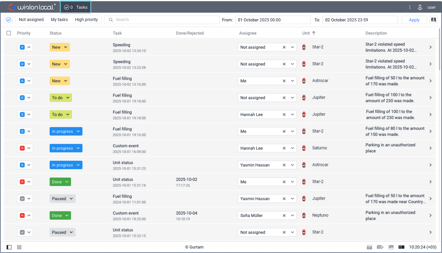 A task is an issue registered for a unit that requires specific actions from the user (for example, contacting the driver, checking data, leaving a comment, etc.).