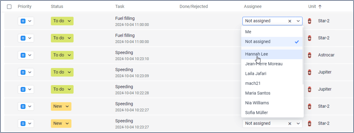 New tasks don’t have an assignee by default. You can assign the task to yourself or to another employee. To do this, select the required user in the Assignee column.