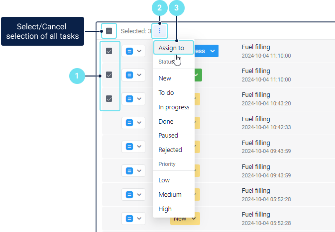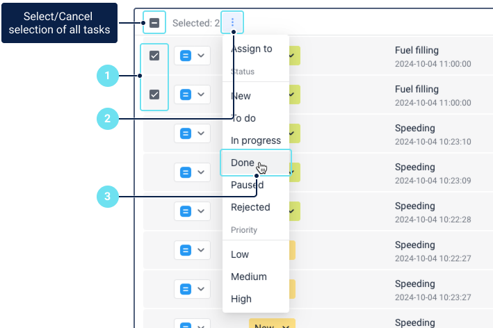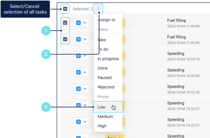 Select the required tasks. To do this, point to a task and check the box in its row. To select all tasks at once, check the box in the table header.