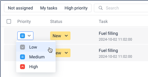 To change the priority of a single task, click on the field in the Priority column and select the necessary option: low, medium or high.