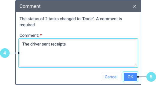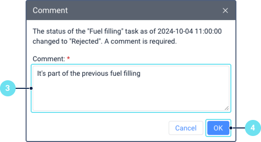 If you selected Done, Paused or Rejected, leave a comment. Comments are also required when changing the task status from Done or Rejected to any other. Comments are limited to 50 characters.