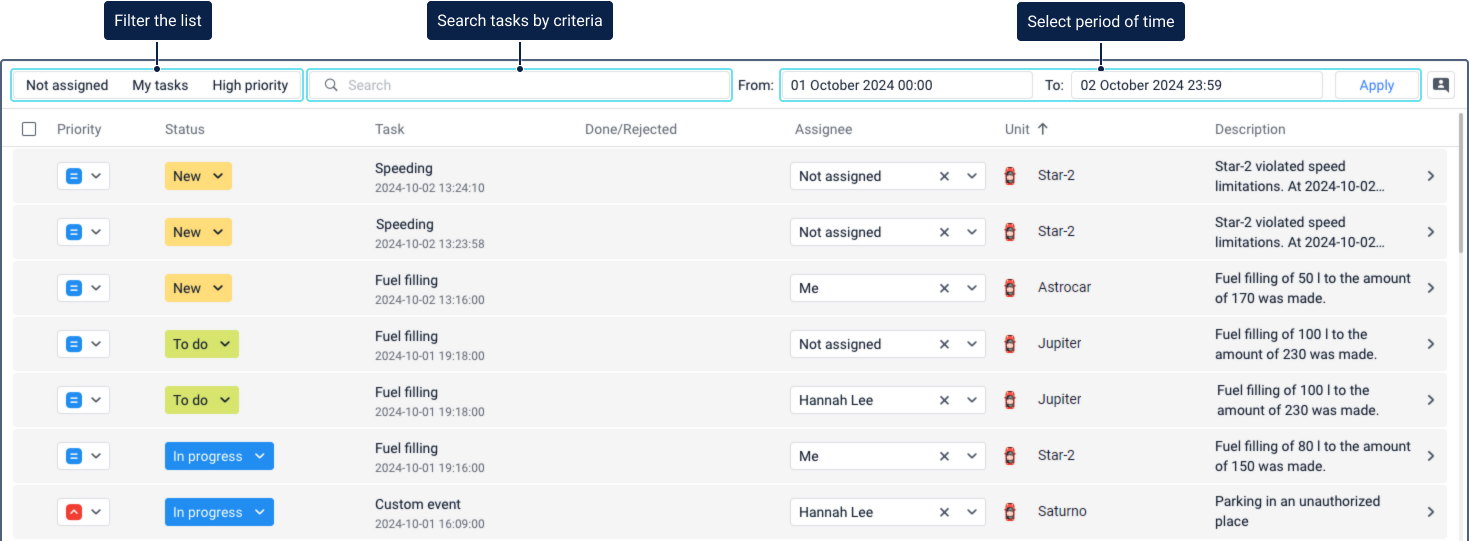 To search for tasks, you can use dynamic search by the following criteria: task name, assignee, unit, status, priority, type (matches the type of the triggered notification or the type selected when creating the task manually), and description. This function works the same way as searching for notifications.