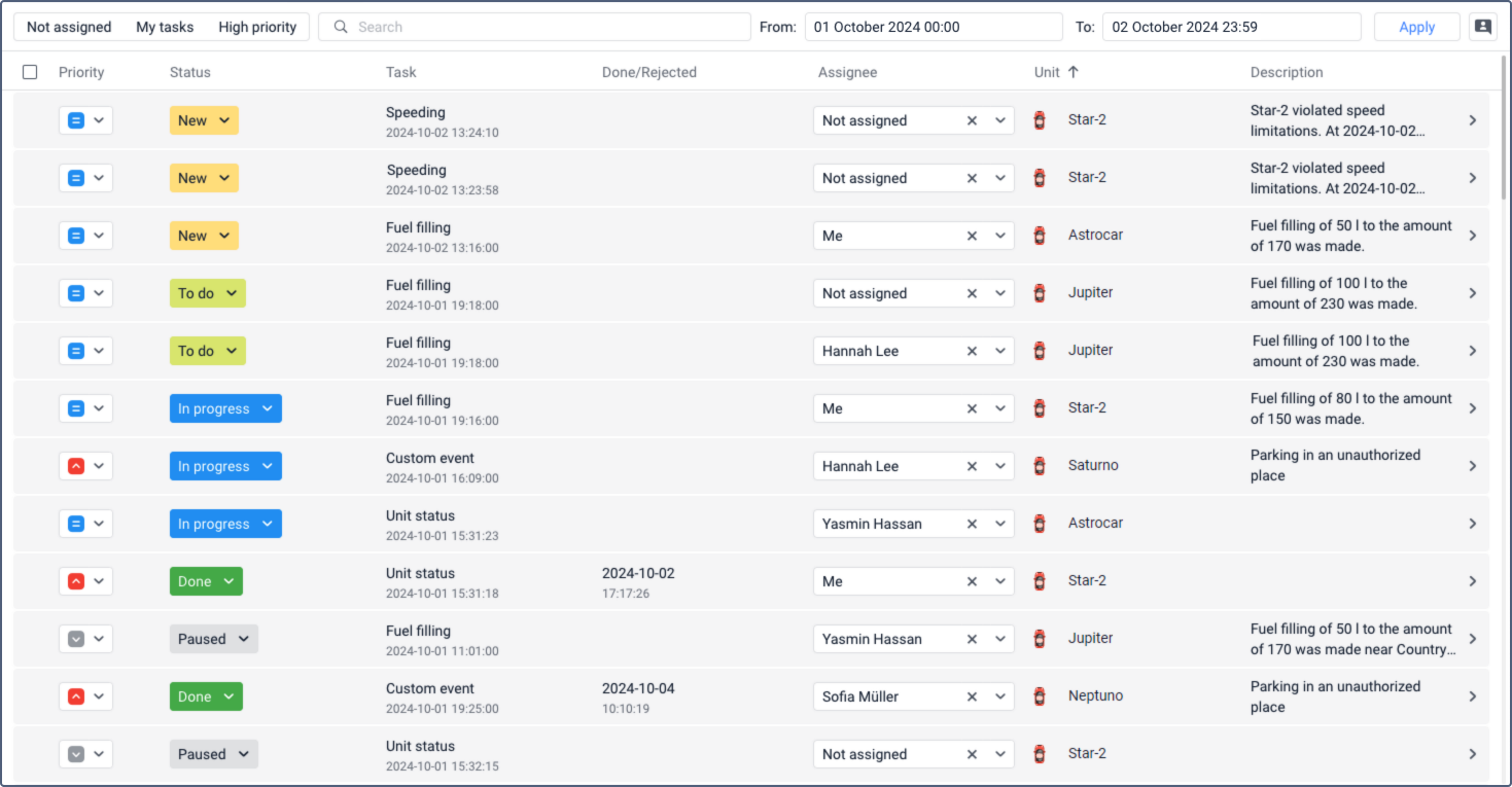 | Done/Rejected | The date and time when the task status was changed to Done or Rejected. If a task has a different status, nothing is shown in this column for it. |