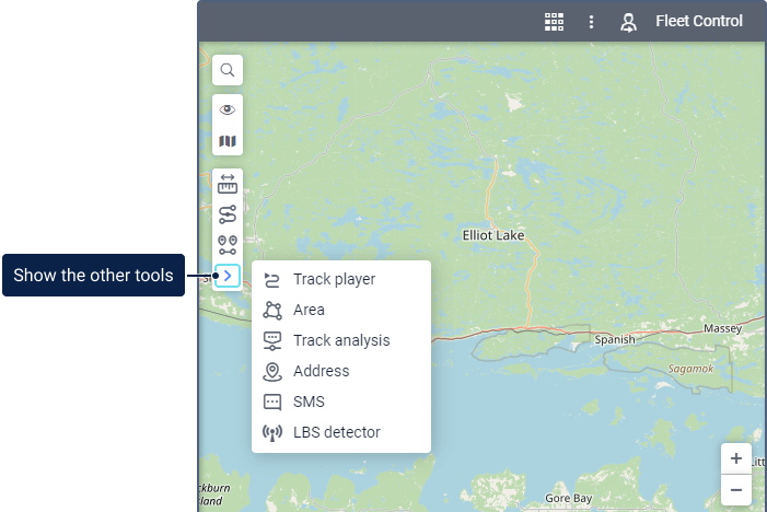 The menu of tools is located on the left side of the map. By default, only the icons of the first three tools are shown. To see the others, click on the icon