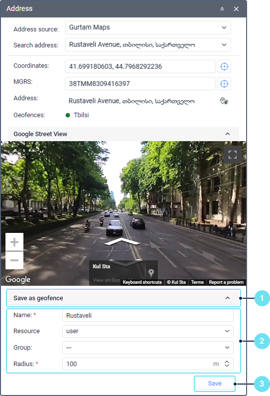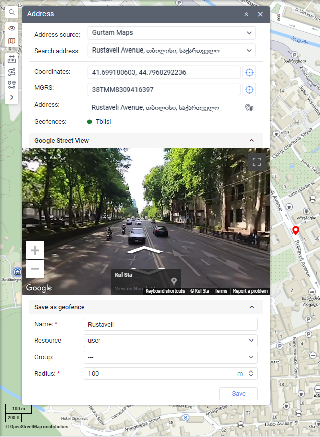 This tool is designed to search for places on the map and determine the address of points. It also allows you to save the marked place as a geofence.
