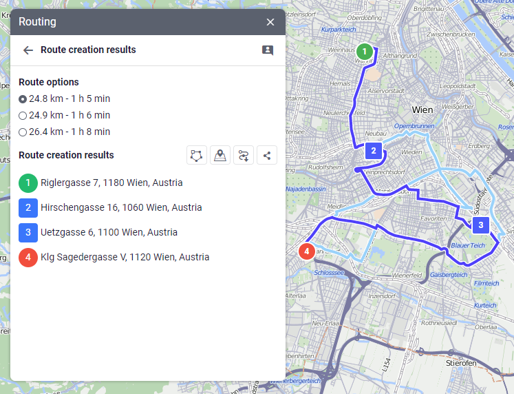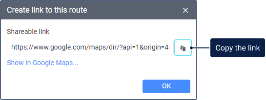 in the window of the created route. You can copy and share the generated link or open it directly in Google Maps.