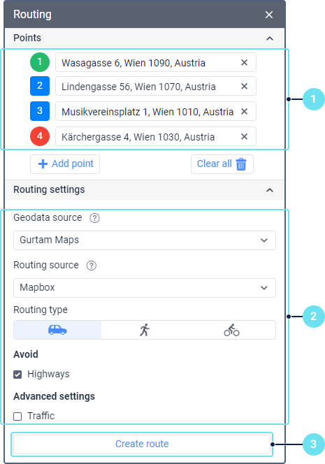 - Specify the addresses of the obligatory route points and, if necessary, add any number of waypoints.