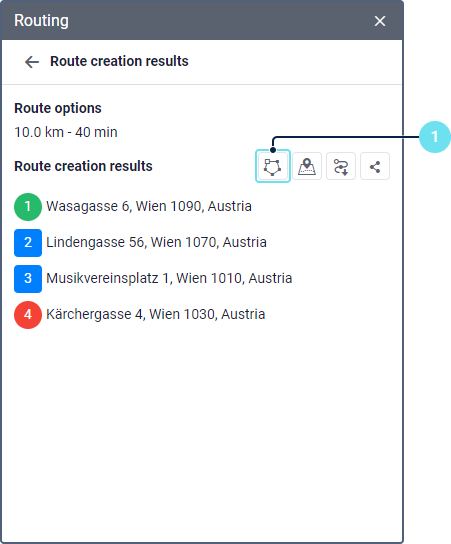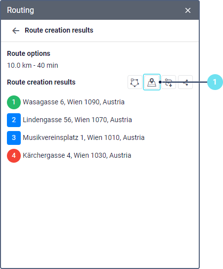 After that, the map displays the route built in accordance with the added points and the specified settings. To change the points or settings and build the route again, click on the icon
