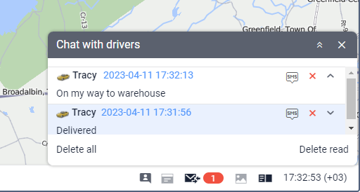 Messages sent by the driver are shown in the log and in the Chat with drivers window in the same way as commands sent from the device. In this window, you can reply to the driver’s messages by clicking on the icon
