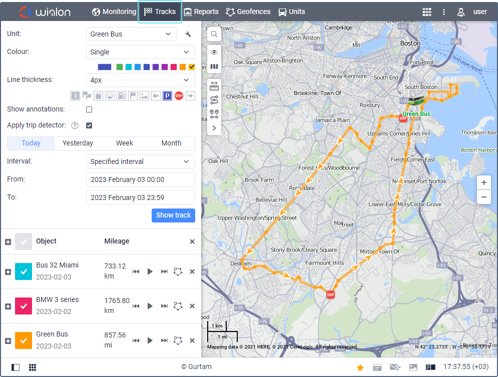 To go to the Tracks tab, click on its name in the top panel or select the item of the same name in the main menu customizer. On this tab, you can view unit tracks and work with them. You can enable markers on tracks to see the places where stops, speedings, fuel fillings and drains, etc. have been detected.