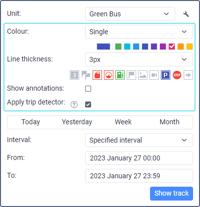 Track parameters include color, line thickness, markers, the Show annotations and Apply trip detector options. You should specify the parameters before requesting the track. Once the track is mapped, you can’t change the parameters.