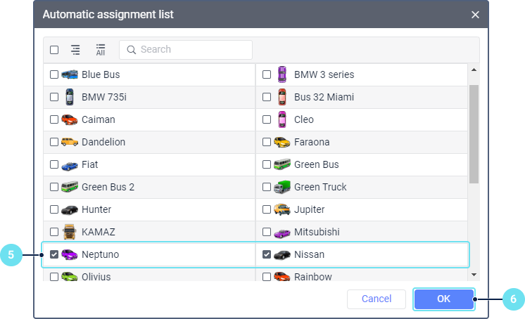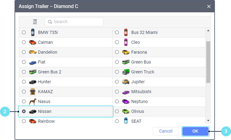 - In the open window, select the unit to which you want to assign the trailer. Here you can see the units from the work list on the Monitoring tab. If no units are displayed, click on the icon