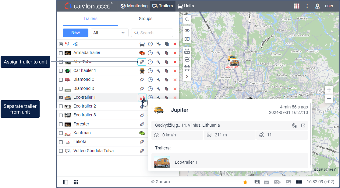 Trailers can be assigned to units manually or automatically. After that, you can work with the assignment history.