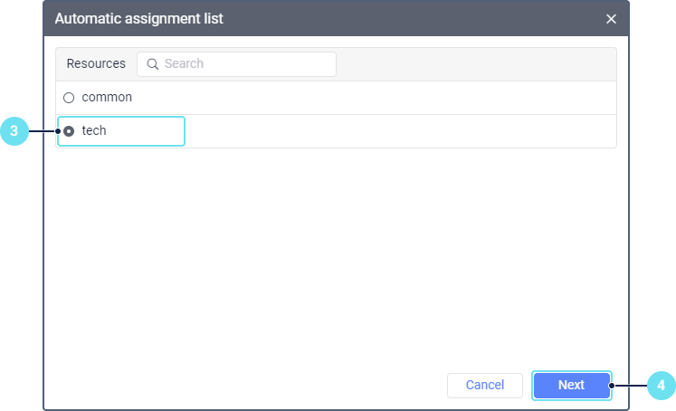 - In the list of resources, select the resource for the trailers of which you want to configure automatic assignment. To find out which trailers belong to a certain resource, apply filtering by resource to the trailer list (displayed to the right of the New button).
