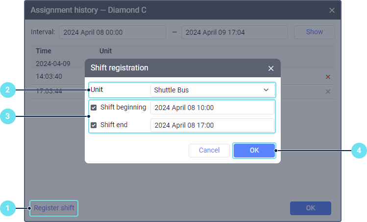 The Assignment history feature allows you to view the history of assignments, add records of assignments manually (register work shifts) and delete them if necessary. To perform these actions, click on the icon