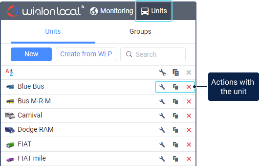 Using the icons opposite the unit name in the list, you can perform the following actions: